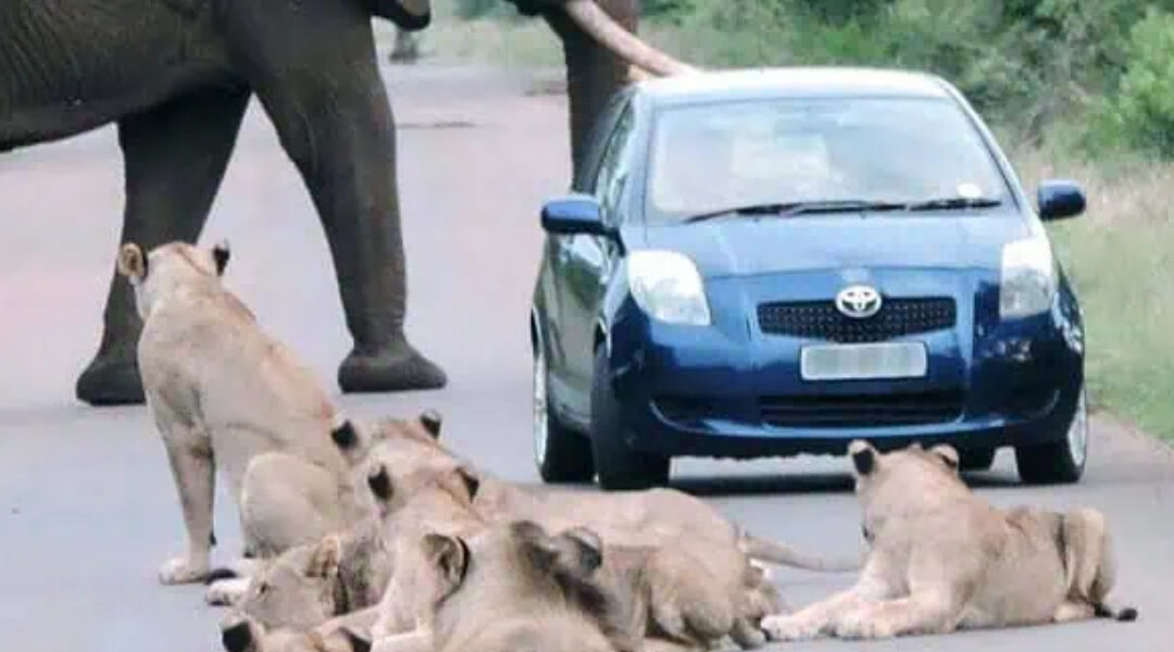 In a matter of seconds, the small blue car was boxed in by two of Africa’s most powerful animals — one end guarded by a towering elephant, the other sealed off by a dozen lions.