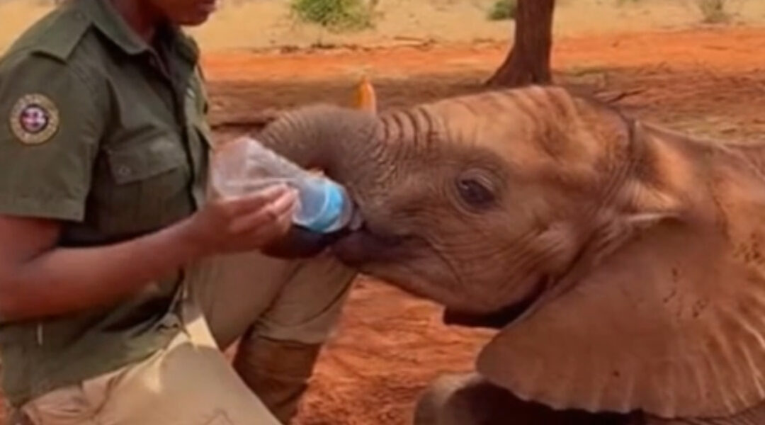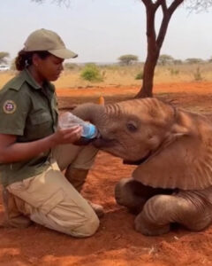 She tipped the bottle just enough for water to bead at the opening. The calf lifted his trunk toward it, the movement awkward and shaky, like a child learning to use unfamiliar limbs. His trunk wavered, missed, then brushed the bottle clumsily.