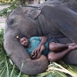 One morning, she walked to where he sat. She lay down slowly, pressing her massive body close. Then, gently, she wrapped her trunk around him—like a lullaby in motion.