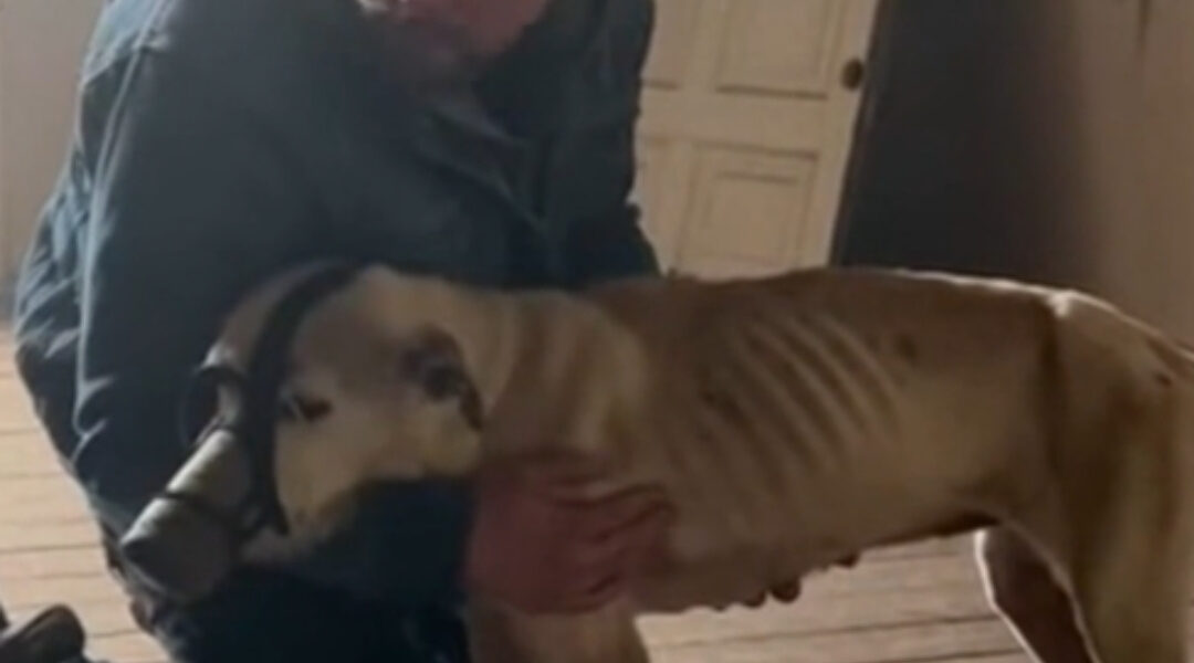 A hound, tall once, now reduced to angles and bone. His ribs pushed sharply against his skin, every breath visible, every movement an effort. A muzzle was strapped tightly around his face, forcing his mouth shut. A collar dug into his neck. He trembled where he stood, legs shaking under a body that had nothing left to give.