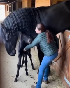 Above him, leaning out from her stall with deep maternal concern, was his mother—a majestic black mare with a flowing, braided mane that cascaded like a river of silk. She had pushed her powerful head and shoulders through the opening, her eyes fixed intently on her newborn. Every few moments, she nickered softly, a low, rumbling sound full of love and quiet urgency. The foal tried to stand tall, but his spindly legs trembled. He took a few unsteady steps, then paused, looking up at his mother as if seeking her strength.